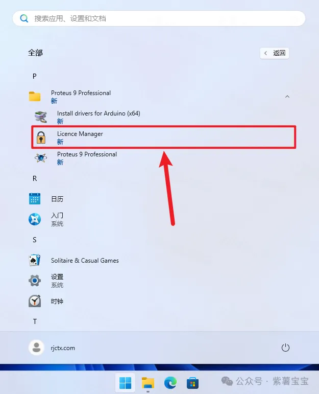 17.点击桌面任务栏中的【开始图标】>点击【所有应用】>双击展开【Proteus 9 Professional】文件夹,点击【Licence Manager】