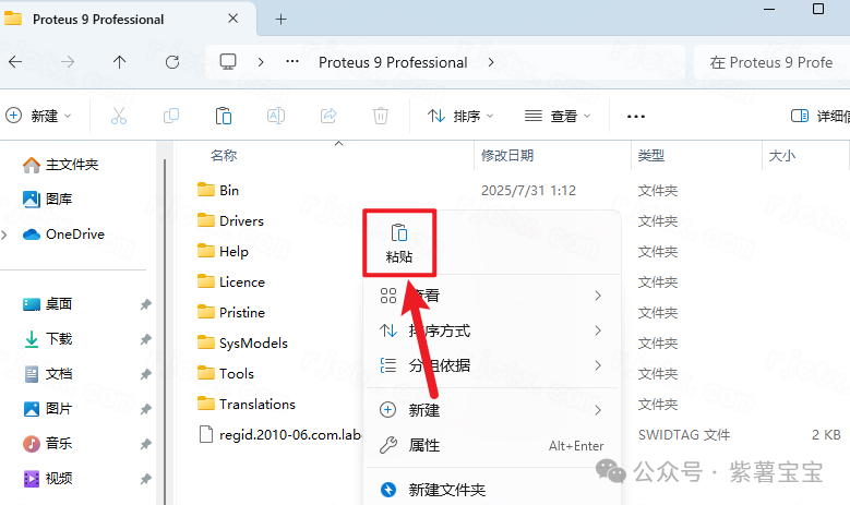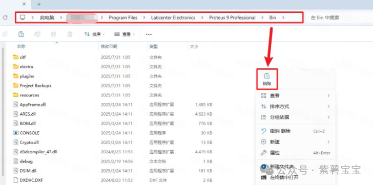 24.打开步骤7软件安装路径【C:\Program Files\Labcenter Electronics\Proteus 9 Professional\Bin】,鼠标右击空白处选择【粘贴】