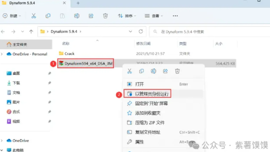 3、找到【Dynaform594_x64…】应用程序,右键选择【以管理员身份运行】它