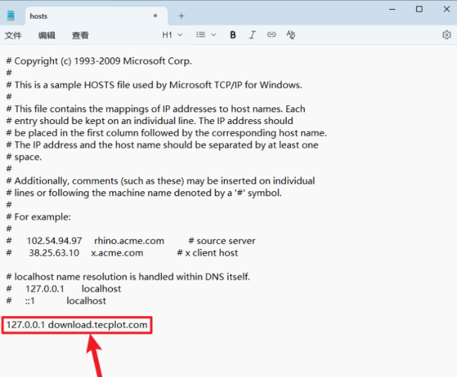 12.修改“host”:在文档最后添加代码【127.0.0.1 download.tecplot.com】,点击右上角【X】退出,点击【保存】