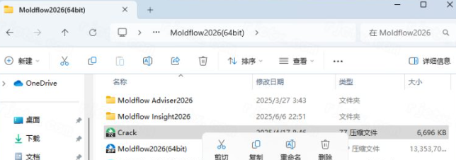 17.打开安装包解压后的【Moldflow2026(64bit)】文件夹,①鼠标右击【Crack】压缩包②选择电脑上安装的解压软件③点击【解压到当前文件夹】