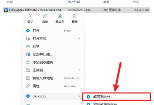 1.下载完成后,鼠标右击【EdrawMax 15.1.4.1481】压缩包,选择【解压至此处】