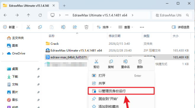 2.打开解压后的文件夹,鼠标右击【EdrawMax 15.1.4.1481】选择【以管理员身份运行】