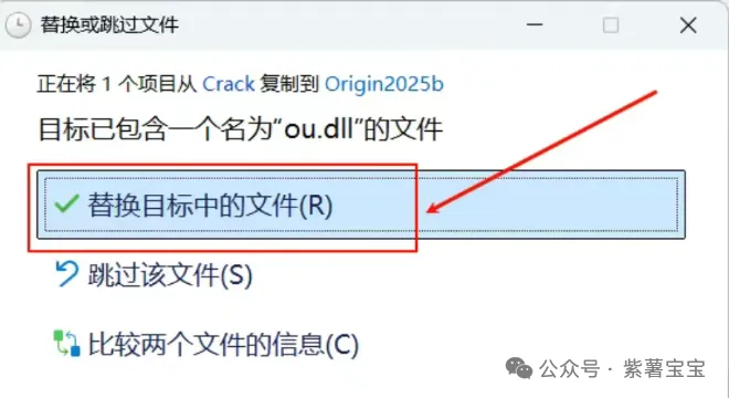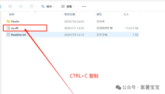 22.打开安装包解压后的【Origin2025b】文件夹中的【Crack】文件夹,鼠标右击【ou.dll】选择【复制】