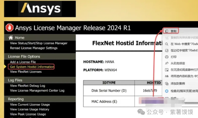 13.在弹出的网页界面,点击【Get System……】,鼠标右击“MAC Address”后方的字符选择【复制】(不要关闭此网页继续后续步骤)。