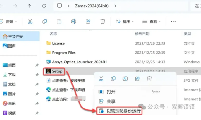 24.打开安装包解压后的【Zemax2024(64bit)】文件夹,鼠标右击【Setup】选择【以管理员身份运行】