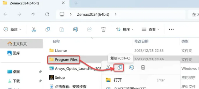 37.打开安装包解压后的【Zemax2024(64bit)】文件夹,鼠标右击【Program Files】选择【复制】。