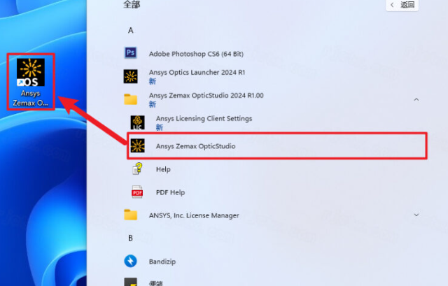 46.创建桌面快捷方式:①点击桌面任务栏中的【开始图标】>点击【所有应用】>双击展开【Ansys Zemax……】文件夹②将【Ansys Zemax……】图标拖到电脑桌面。