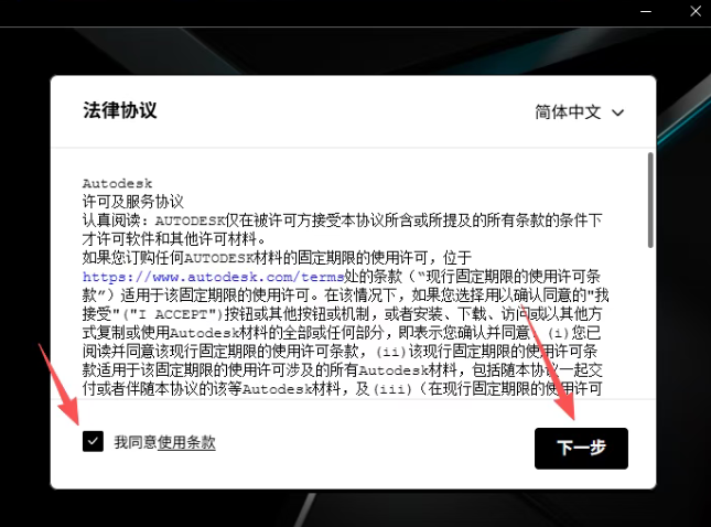 6、勾选我同意使用条款,然后下一步