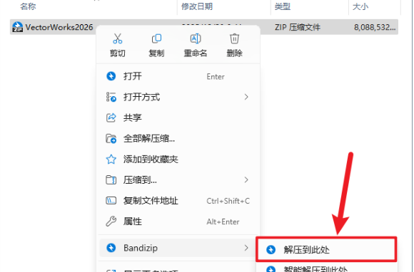 1.下载完成后,鼠标右击【VectorWorks 2026】压缩包,选择【解压至此处】