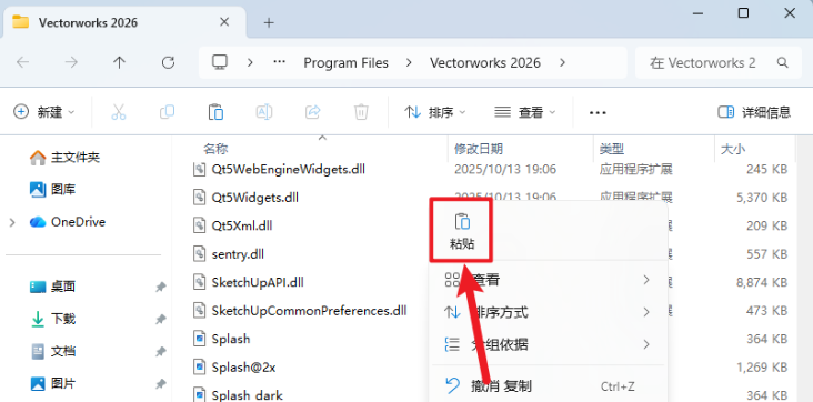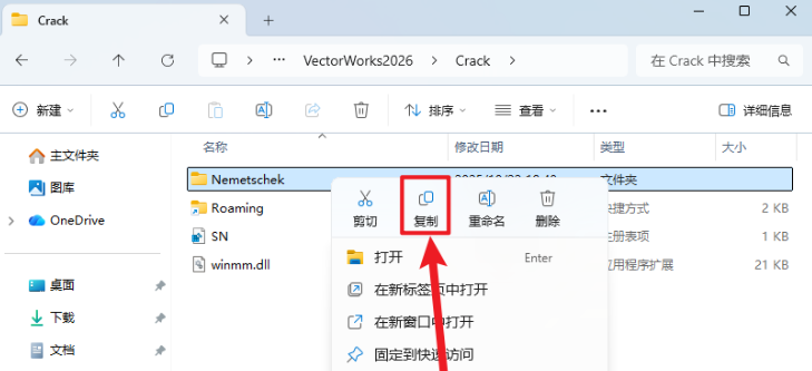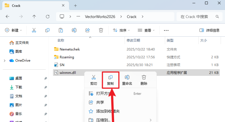 13.打开安装包解压后的【VectorWorks 2026(64bit)】文件夹中的【Crack】文件夹,鼠标右击【winmm.dll】选择【复制】