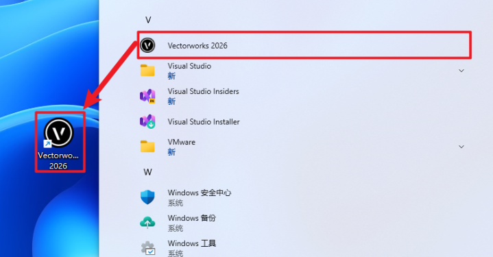 14.创建桌面快捷方式:①点击桌面任务栏中的【开始图标】>点击【所有应用】②将【VectorWorks 2026】图标拖到电脑桌面