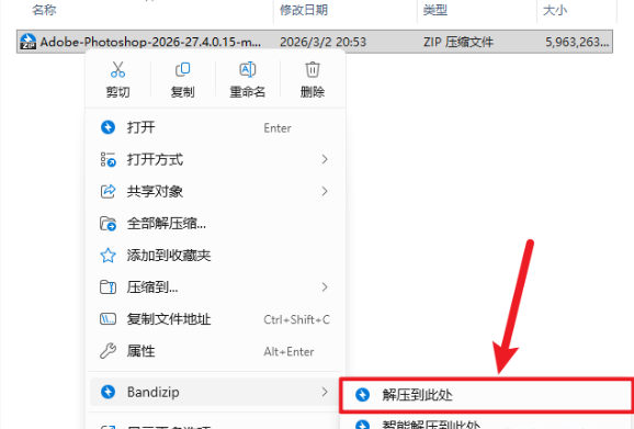 1.下载完成后,鼠标右击【Adobe Photoshop 2026 v27.4.0.15】压缩包,选择【解压至此处】