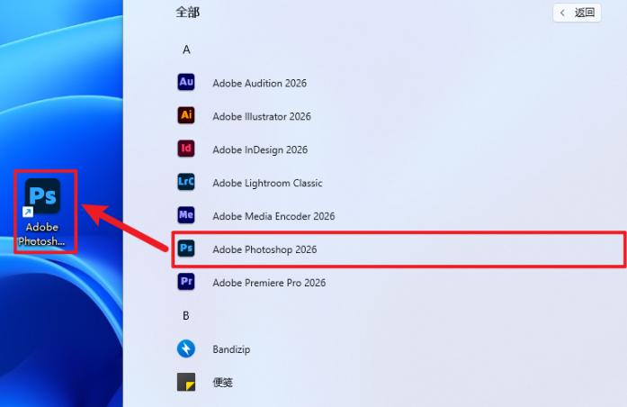 7.打开开始菜单,在所有应用中找到【Adobe Photoshop 2026 v27.4.0.15】,鼠标按住软件不动,将软件图标拖动到桌面