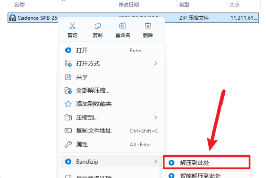 1.下载完成后,鼠标右击【Cadence SPB 25】压缩包,选择【解压至此处】