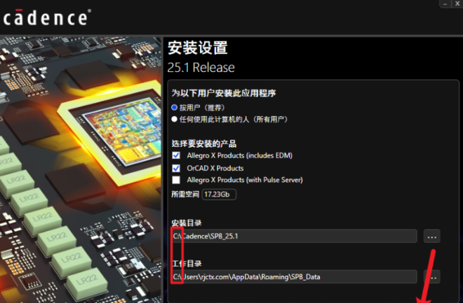 15.选择软件的安装路径【如:C:\Cadence\SPB_25.1 】(步骤11中的目录前两层目录)点击【确定】