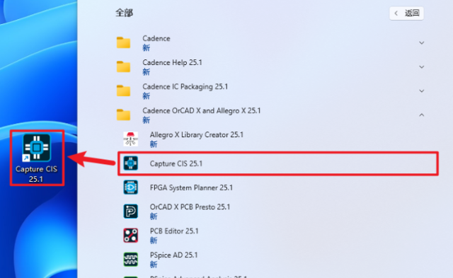9.创建桌面快捷方式:①点击桌面任务栏中的【开始图标】>点击【所有应用】>双击展开【Cadence OrCAD X and…】文件夹②将【Capture CIS 25.1】图标拖到电脑桌面