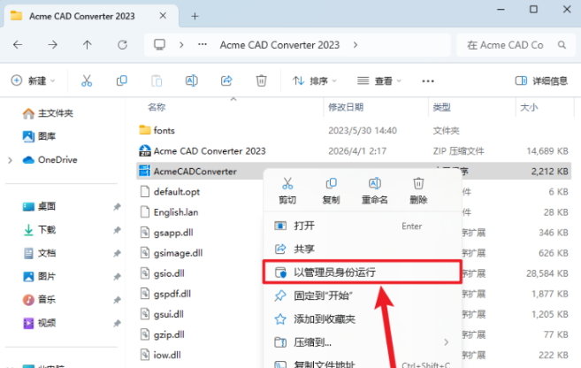 2.鼠标右击【Acme CAD Converter 2023】软件,点击【以管理员身份运行】