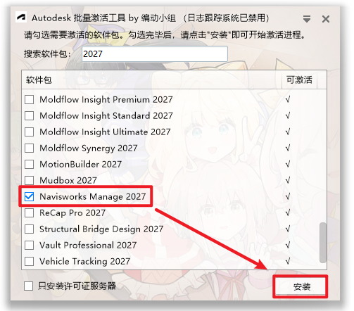 8.勾选“NavisWorks Manage 2027”,点击“安装”