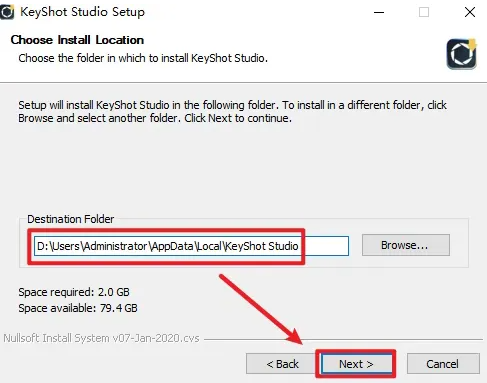 5、修改安装路径,建议安装到D盘或者E盘,可以直接修改最前面的盘符:C改为D即可(安装路径不能有中文),点击下一步