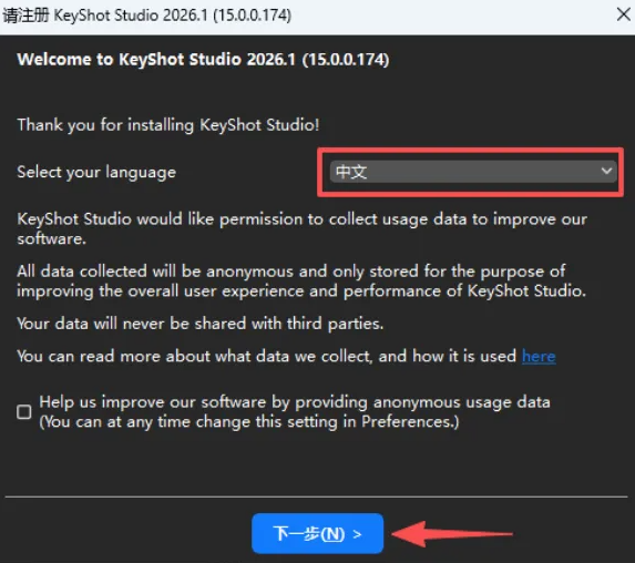 18、回到电脑桌面,运行keyshot,语言选择中文,点下一步