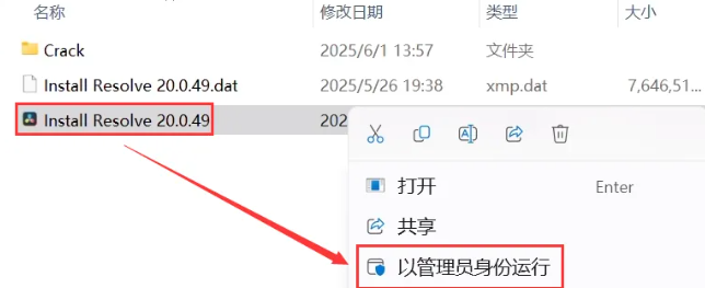 2.选中【Install Resolve 20.0】程序,鼠标右键点击【以管理员身份运行】