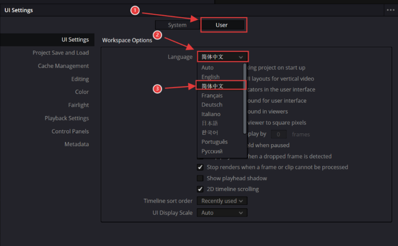 进入达芬奇主页,点击右上角的【DaVinci Resolve】展开再点击【Preferences…】点击【User】,展开Language项选择【简体中文】,然后点击下方【Save】弹窗点击【OK】关闭达芬奇程序,再重新打开就是中文版了