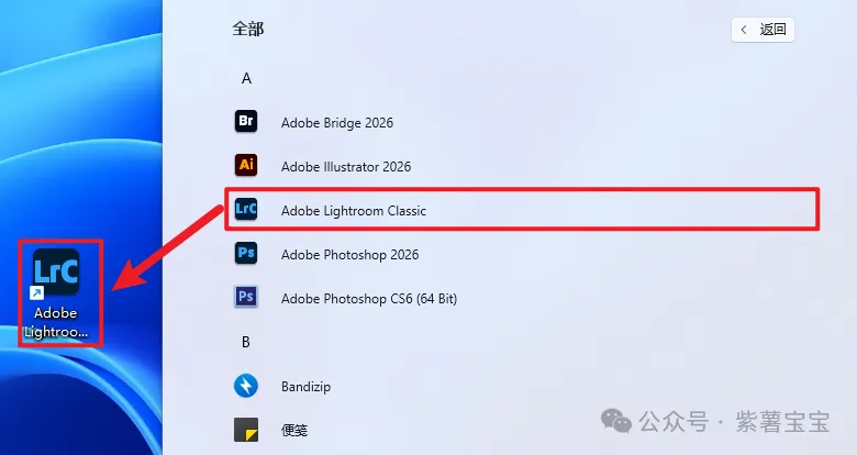 6.创建桌面快捷方式:①点击桌面任务栏中的【开始图标】>点击【所有应用】②将【Adobe Lightroom Classic】图标拖到电脑桌面