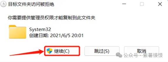 4.如果提示需要管理员权限,则点击【继续】,如果没有忽略